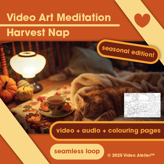 Video Art Meditation Relaxation Stress-Relief "Harvest Nap" Cat Pumpkin Cottage Loop 4K Seamless Virtual Ambient Calm Harvest Thanksgiving