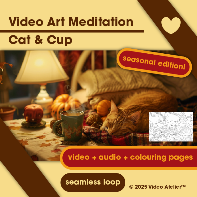 Video Art Meditation Relaxation Stress-Relief "Cat And Cup" Cat Pumpkin Cottage Loop 4K Seamless Virtual Ambient Calm Harvest Thanksgiving